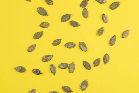Pumpkin seeds on a yellow background. Top views