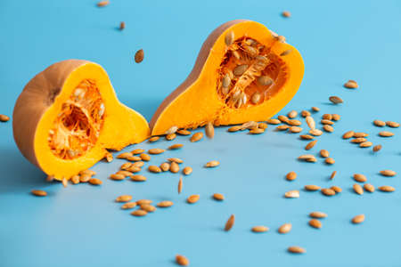 Sliced pumpkin and falling seeds on a blue background