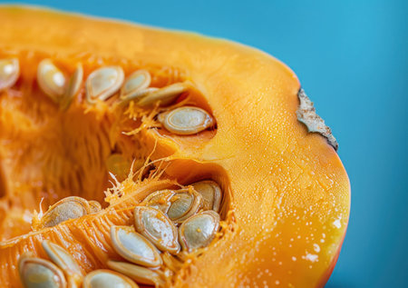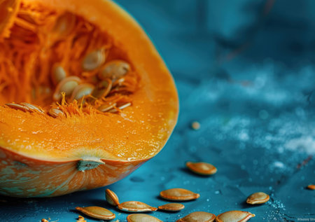 Freshly cut orange pumpkin displaying vibrant orange flesh and seeds with scattered pumpkin seeds on a blue textured background. Autumn harvest concept.