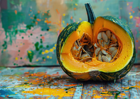 A freshly cut pumpkin half revealing its seeds and fibers, set against an abstract colorful splatter background
