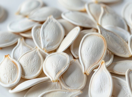Close-up of scattered pumpkin seeds on a white surface, showcasing their smooth texture and unique shapes. Healthy food and snack concept.