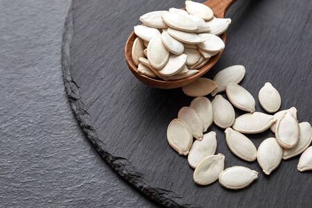 Pumpkin seeds and a wooden spoon on a dark table. Black slateboard with wooden bowl. Close up on a black background. copy space for text.
