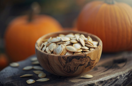 Wooden bowl filled with roasted pumpkin seeds