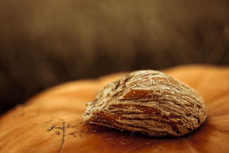 Closeup of stem of giant orange pumpkin. Autumn vegetable. Fall, Halloween and Thanksgiving design. Selective focus. Top view.