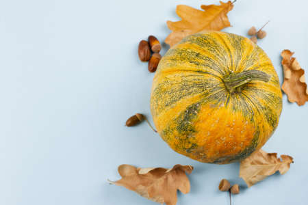 Pumpkin with autumn leaves on a blue background. View from above. Place for text. Harvesting concept.