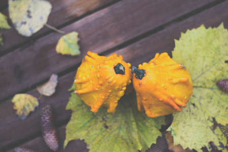 Decorative pumpkins on a wooden background. Autumn day. Top view