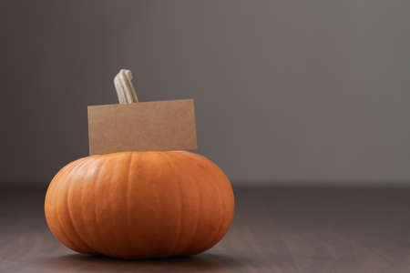 Small orange pumpkin on black walnut table with white wall background and empty paper card