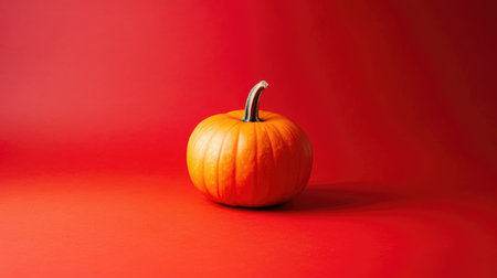 Pumpkin isolated on red background with copy space. Ripe orange squash. Halloween or Thanksgiving harvest season concept.