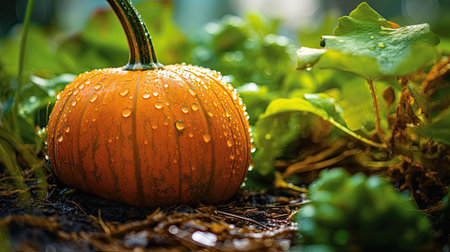 An AI generated illustration of a vibrant orange pumpkin on the ground, its surface glistening with water droplets