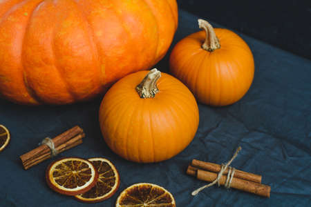 Festive still life of pumpkins, orange slices, cinnamon and star anise