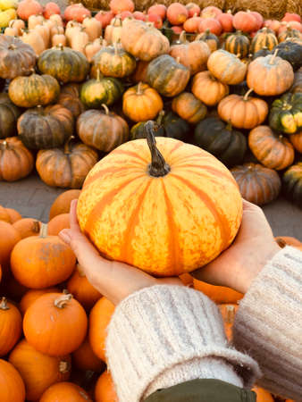 Woman holding orange pumpkin in her hands over the multi colored and different kinds of pumpkins in the background.