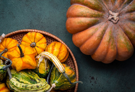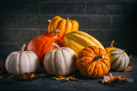 Fresh organic colored squashes and pumpkins in different varieties with dark background. Colorful vegetables as Thanksgiving day and harvest concept.