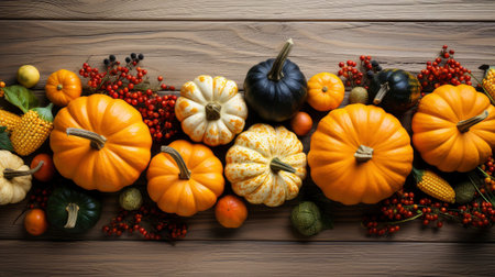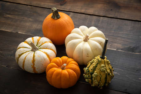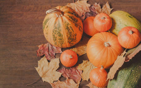 Pumpkins harvest on wood background. Autumn colors orange season for Halloween, Thanksgiving.