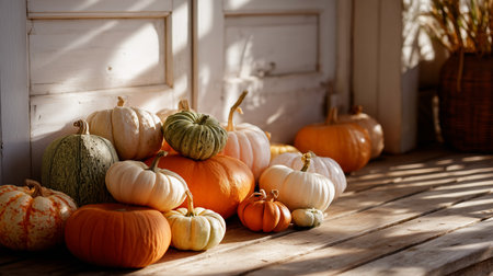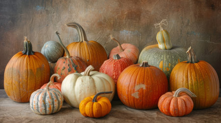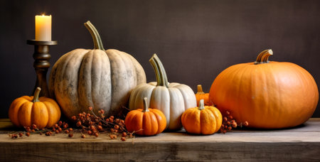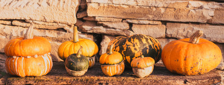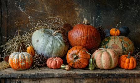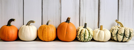 Wooden shelf decorated with pumpkins and gourds of different shapes and colors. Rustic autumn still life perfect for seasonal markets, postcards and holiday design.
