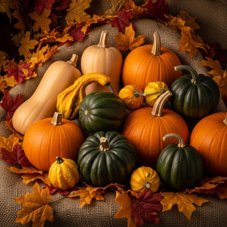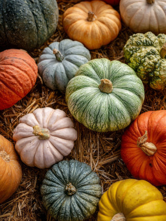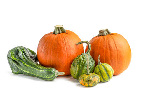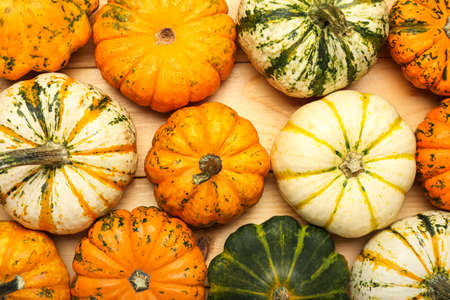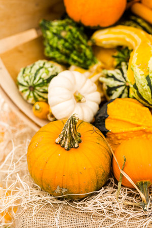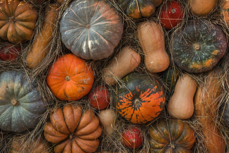 Autumn harvest colorful squashes and pumpkins in different varieties.
