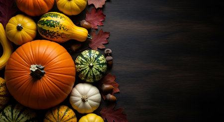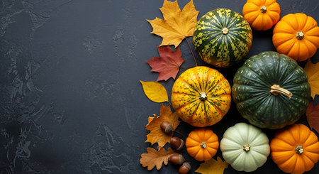 A top-down view of a collection of various pumpkins and gourds arranged on a dark, textured surface. The assortment includes green striped gourds, bright orange pumpkins, and a pale green pumpkin. Scattered amongst the gourds are dried maple leaves in shades of yellow and red, and a few acorns. The composition is rich in autumnal colors and textures, with ample negative space on the left side of the image.