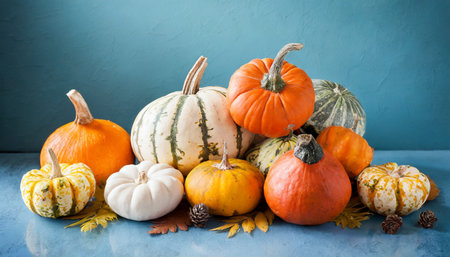 Two colorful pumpkins and a blue textured background. A striped pumpkin with an unusual shape and a round orange pumpkin. Autumn composition. Selective Focus