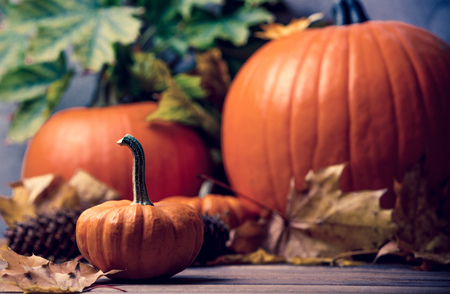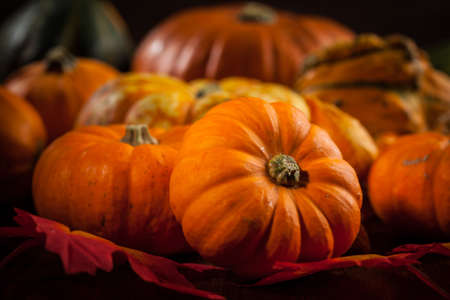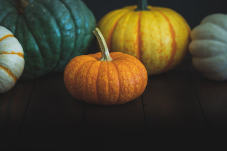 Autumn pumpkins on wooden background. Selective focus. Close up.
