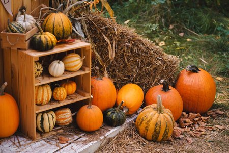ripe pumpkins of different sizes lie in the garden on a background of haystacks / vegetables for autumn holidays