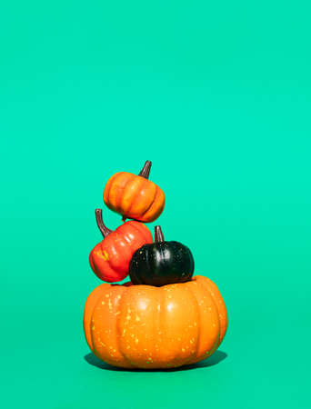 Retro styled conceptual still life arrangement with pumpkins on green background. Halloween holiday theme creative concept. Autumn colors. Modern aesthetic. Copy space.