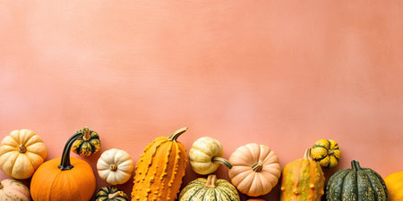 Banner with group of decorative pumpkins top view on pink background. Autumn flat lay.