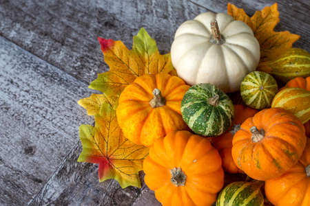 Colorful pumpkins and autumn leaves on rustic wooden background. Autumn harvest.