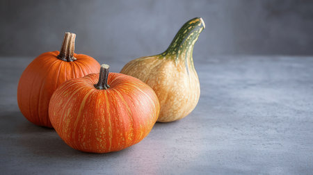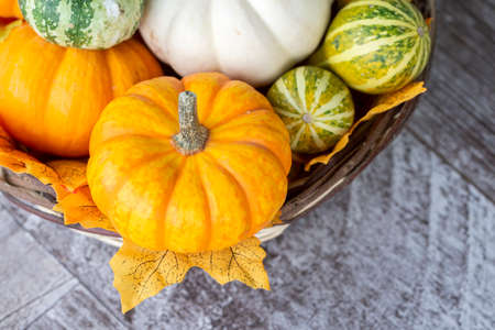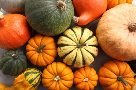 Autumn harvest, colorful pumpkins on a gray ceramic background.