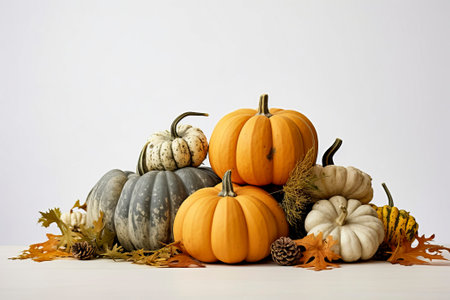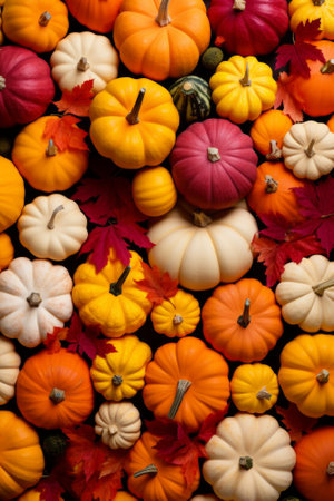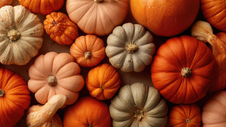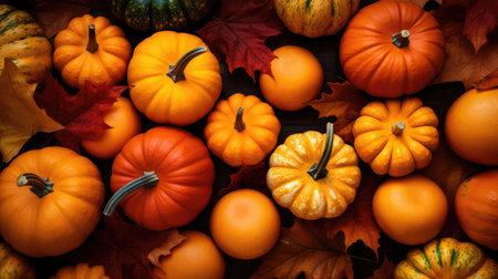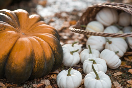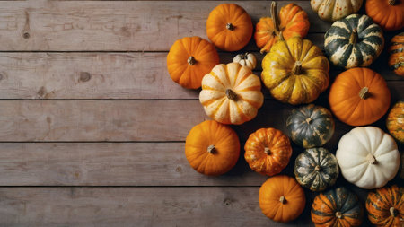 Bright orange and white miniature pumpkins and decorative gourds creating a rustic flat lay arrangement, symbolizing the cozy fall season and celebrating Halloween and Thanksgiving