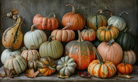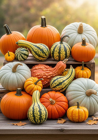 A vibrant display of pumpkins and gourds on a wooden table outdoors