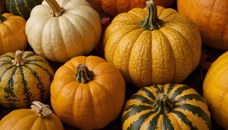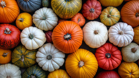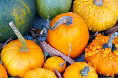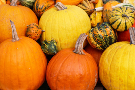 Autumn harvest colorful pumpkins and squashes in different varieties at farm market or seasonal festival. Background of decorative fall and winter squashes