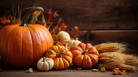 A vibrant display of pumpkins and corn at a rustic autumnal market stand