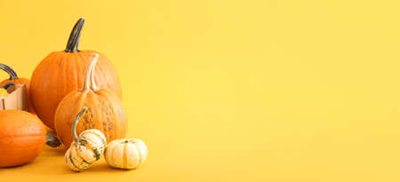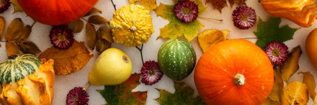 Autumn time, background of various pumpkins and fallen leaves and chrysanthemum flowers, fall harvest, banner