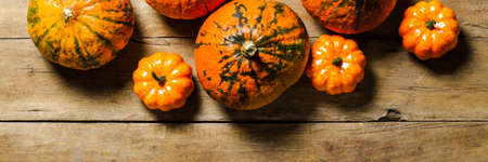 Pumpkins on a wooden background. Harvest concept, autumn, Halloween eve. Banner. Flat lay, top view.