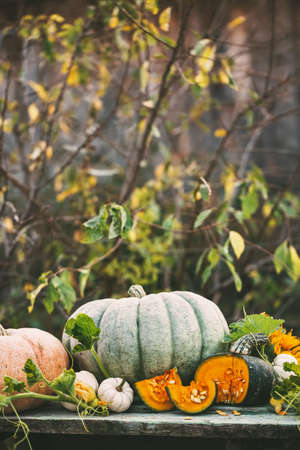 Fresh organic raw pumpkins in an autumn garden. Vegetables for a healthy diet.