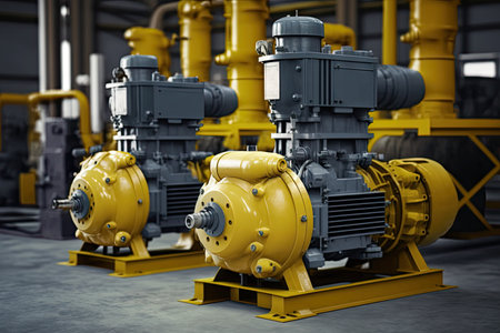 An intricate industrial pump system showcasing yellow pipes and black electric motors within a modern facility. Ideal for engineering and technology projects.