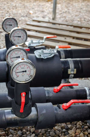 Close up of water pressure sensor or manometer with pipes and valves. Industrial concept