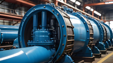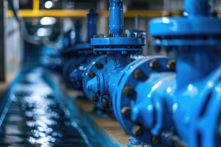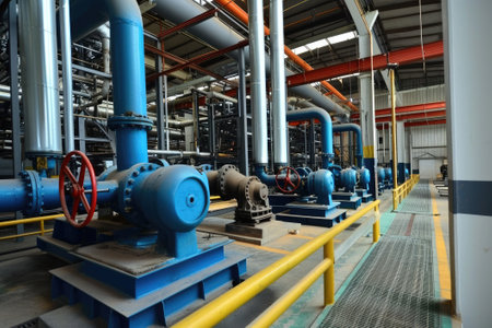Industrial piping system featuring blue valves and pumps in a mechanical setting. concept of engineering, industrial machinery, technical infrastructure.