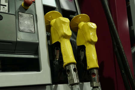 KUALA LUMPUR, MALAYSIA -MARCH 26, 2020: Fuel nozzle used to pumping petrol into a vehicle at the petrol station. Nozzles should be put in place when not in use.