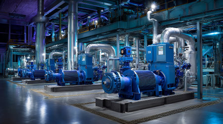 Industrial facility featuring a row of powerful blue centrifugal pumps, motors, and complex piping systems, demonstrating modern water processing and circulation technology