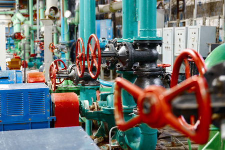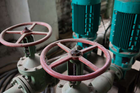 Industrial interior of water pump with valves, pressure gauges, motors inside vintage engine room. Urban powerful pipelines and pumps indoors. Concept of automatic control systems. Copy ad text space