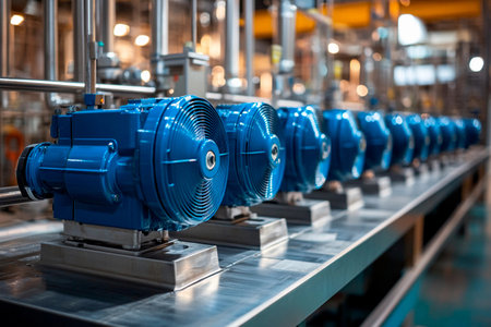 A line of electric motors is neatly arranged on a stainless steel surface in an industrial workshop. The bright lighting highlights the details of each motor and metallic structure.
