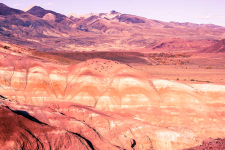 Colorful red rocks on a Sunny day. Beautiful view of the mountains of the Kyzyl-Chin, Altai. The Martian landscape of the canyon.