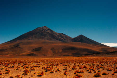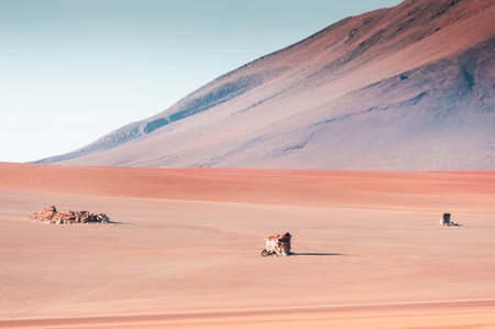 Rocks in the desert with red sand in Altiplano plateau, Bolivia. View of the volcanoes and the blue sky. South America landscapes