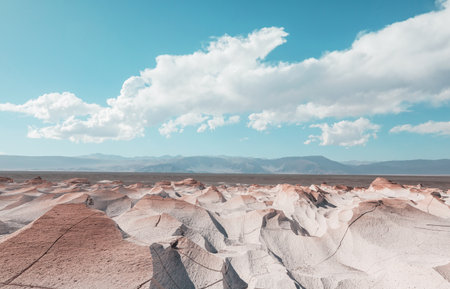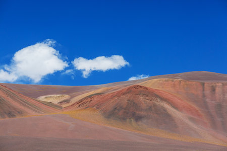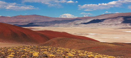Desert landscape with red hills and the blue sky with clouds, Altiplano plateau, Bolivia. South America landscapes