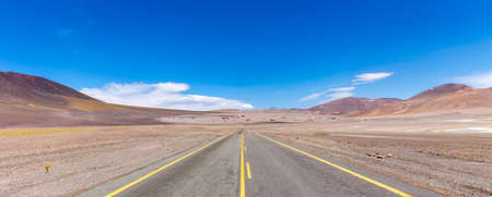 Asphalt road through the Atacama desert, Chile leading towards distant mountains and salt pans