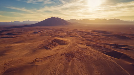 Aerial view of the Atacama Desert with barren, sunlit plains and large open sky for copy