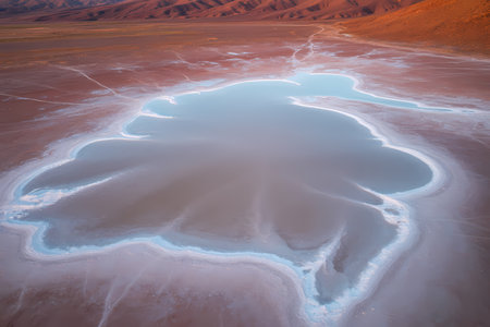 Abstract aerial view of salt lake, vibrant blue water, arid desert terrain, white salt flats, mountain backdrop