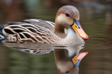 close-up of a large duck, with its reflection visible in the still waters, created with generative ai