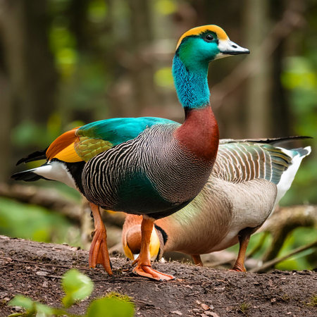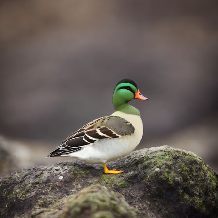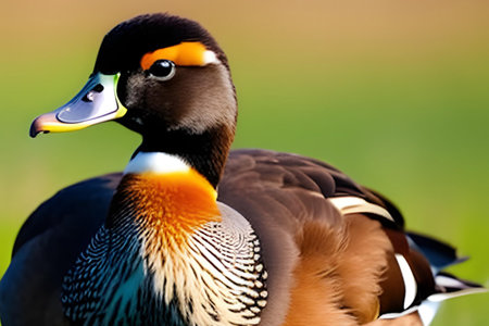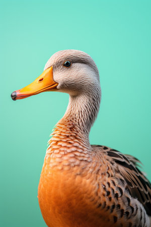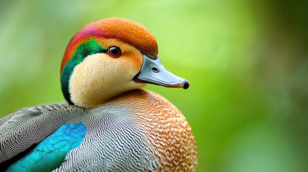 This captivating portrait showcases a colorful duck with vibrant feathers, emphasizing the intricate details of its plumage against a soft green background.