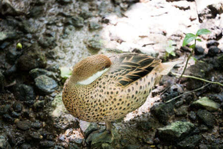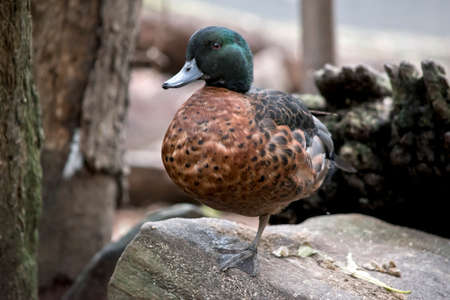 the male chestnut teal is resting on a rock